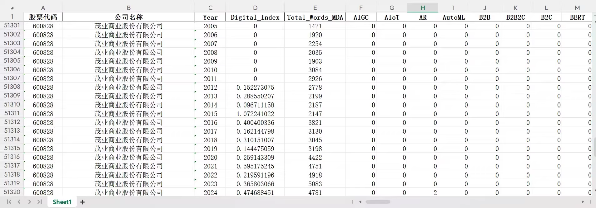 包含指标:股票代码、年份、MD&A总词数、数字化转型总指数、147个细分关键词词频