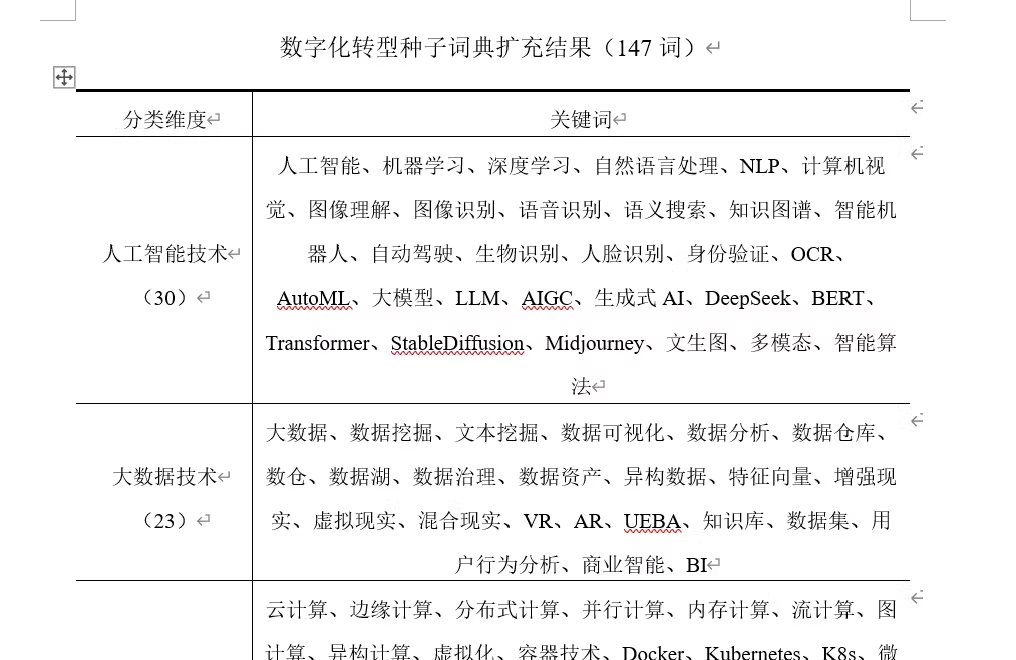 ✅ 采用Word2Vec机器学习模型对种子词进行训练扩充,人工筛选,剔除“等线”“大数”等干扰词,保留“UEDA”“RAG”“大模型”等前沿词