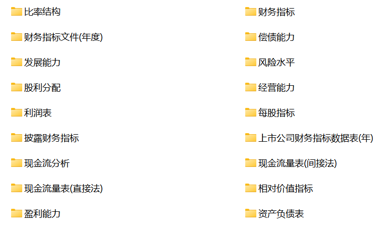 经营能力、偿债能力、发展能力、盈利能力、相对价值指标、风险水平、财务指标文件资产负债表、现金流量表(直接法)、现金流量表(间接法)、利润表等840+指标。全部合并为一张面板!